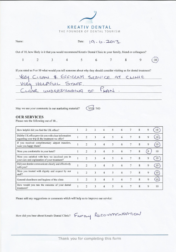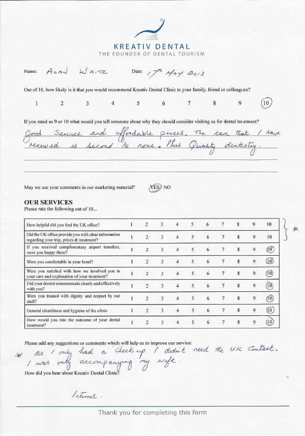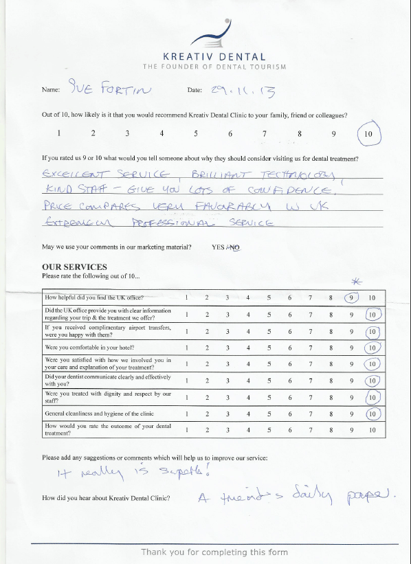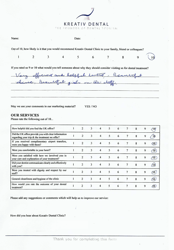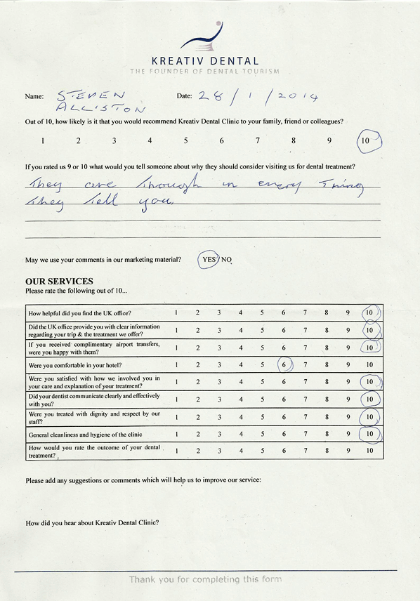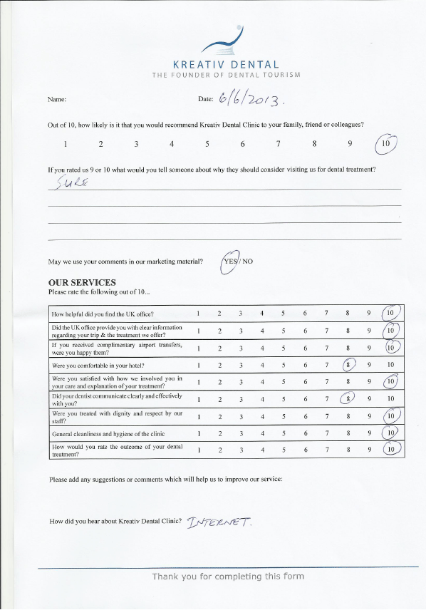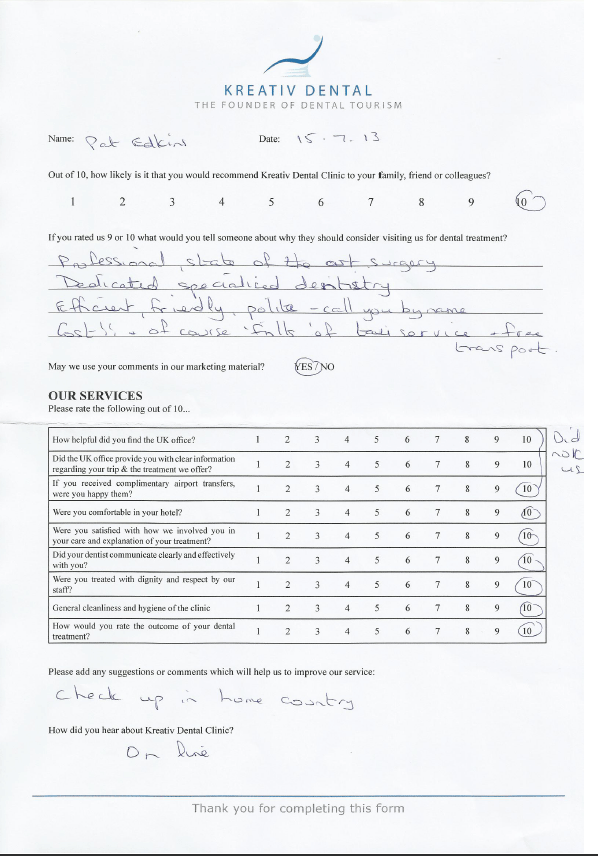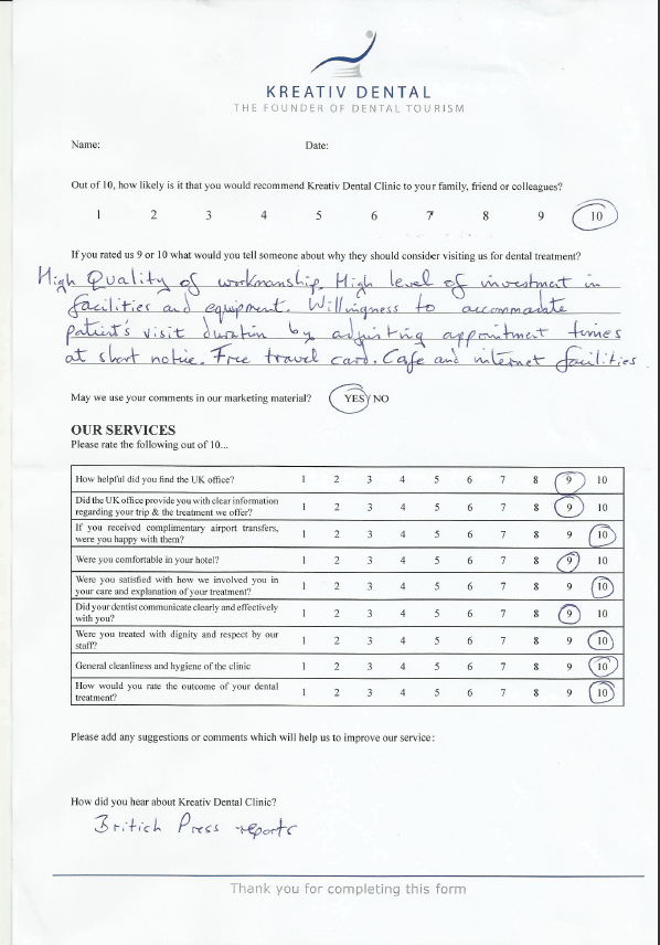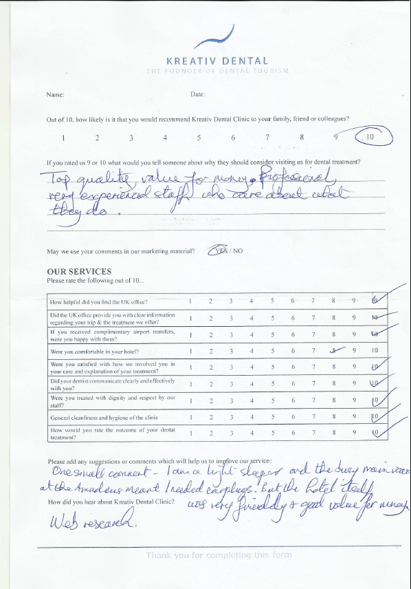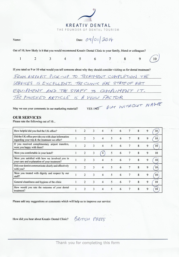 In May 2013 we began to publish hand-written review forms from UK patients. These forms are given to our patients whilst they are at the clinic. These real treatment reviews allow you to see exactly what people are saying about our services.